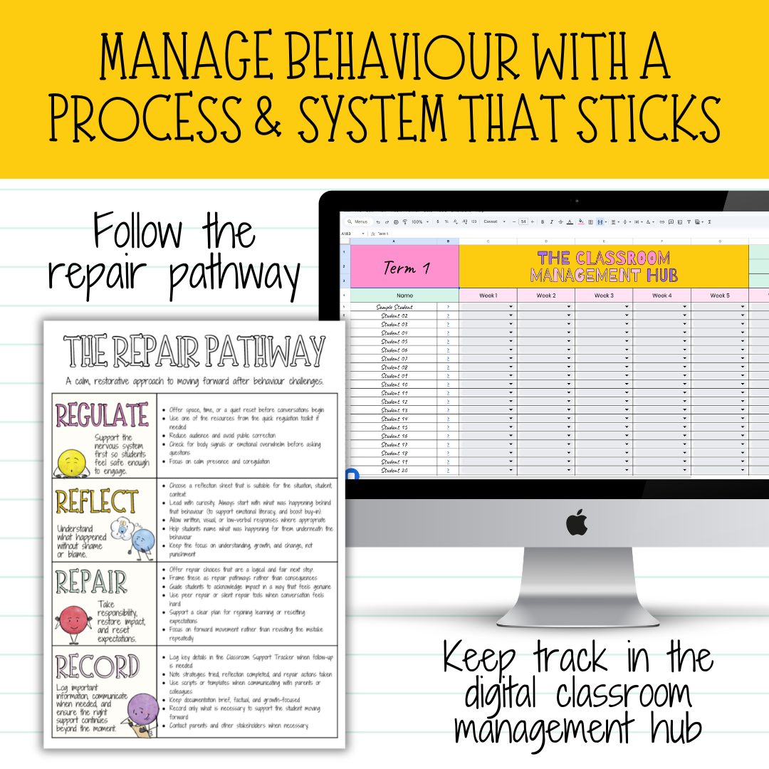 The Reflect & Repair Toolkit is a complete restorative behaviour framework that guides students through regulation, honest reflection, meaningful repair, and clear follow-through, without relying on outdated punitive classroom management. All the support, accountability, and student buy-in, without the shame.