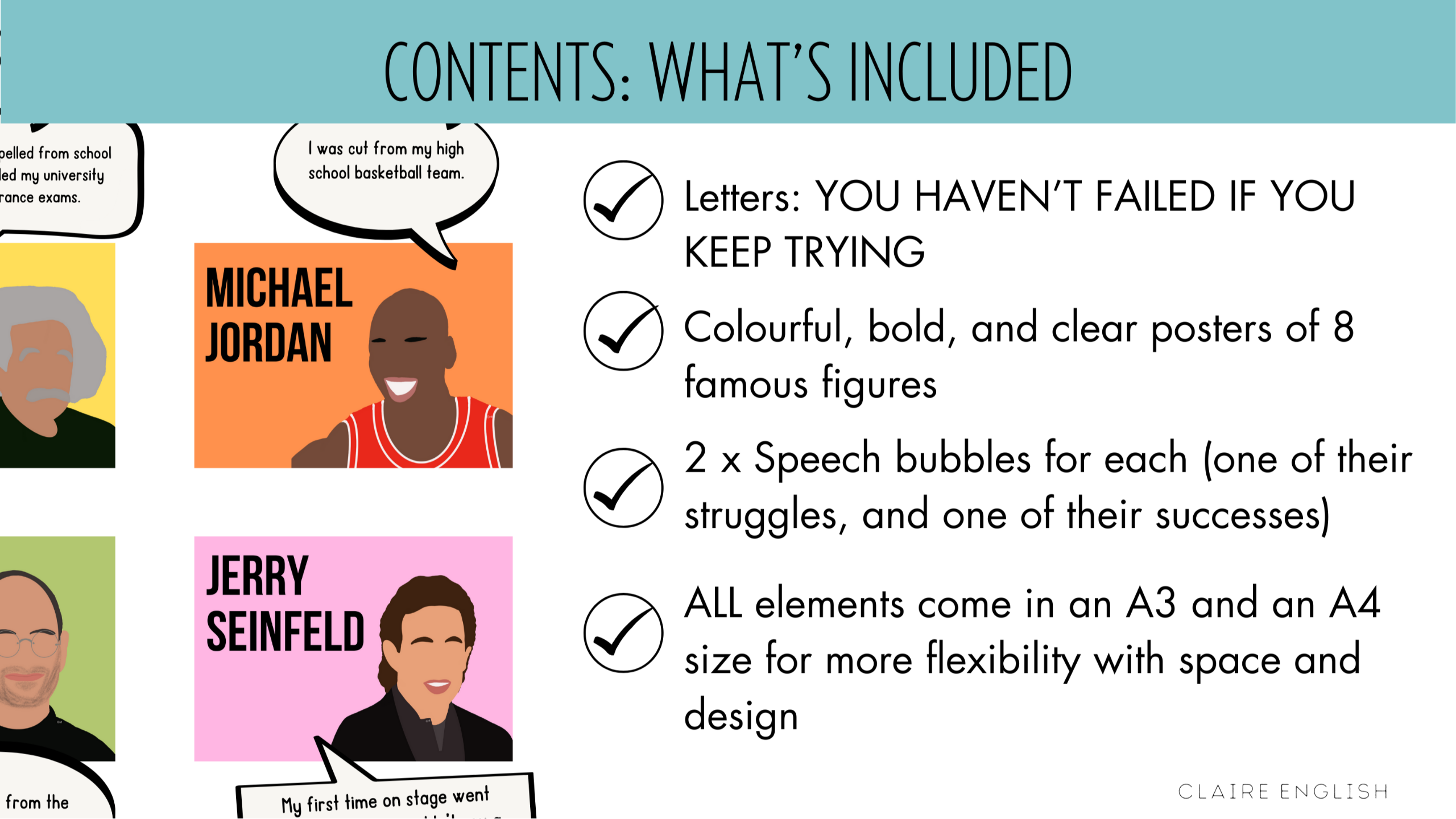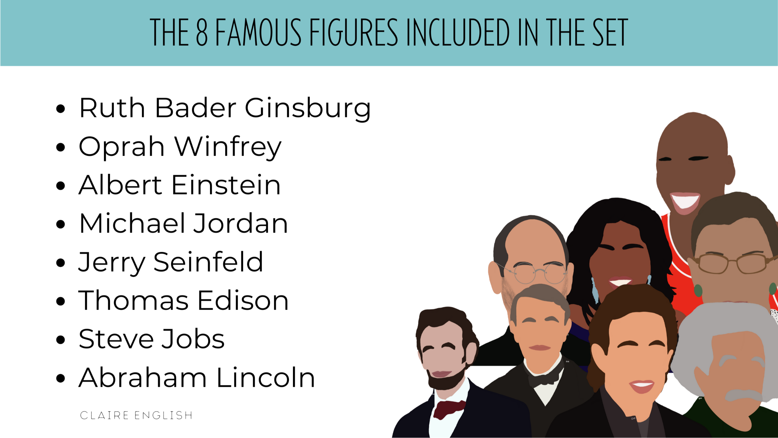 - Colourful, bold, and clear posters of 8 famous figures