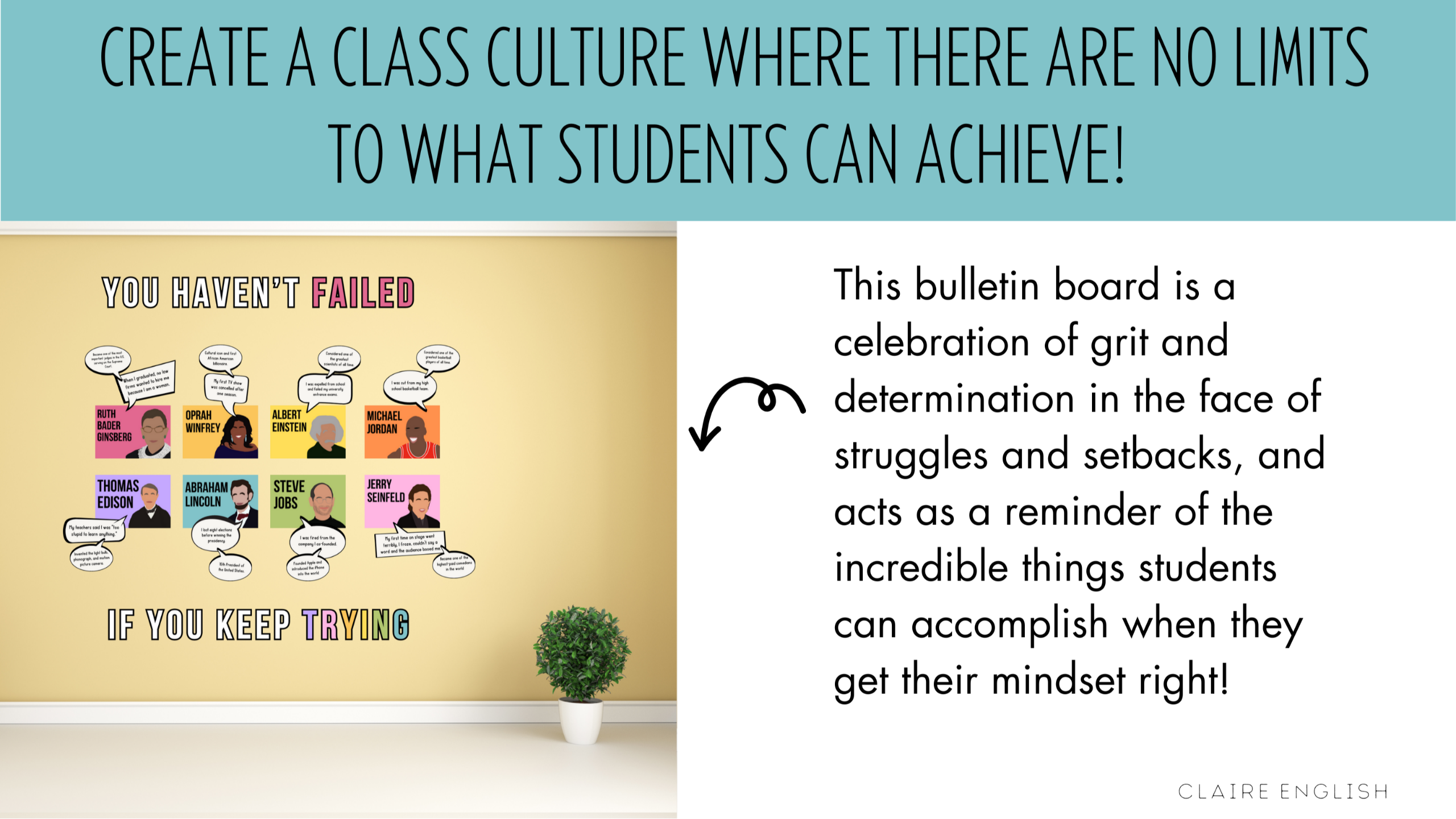 Build a class culture of resilience and grit through this inspiring Growth Mindset bulletin board of famous ‘failures’. It is the perfect SEL display for your classroom décor (AND behaviour management approach).